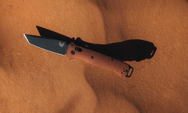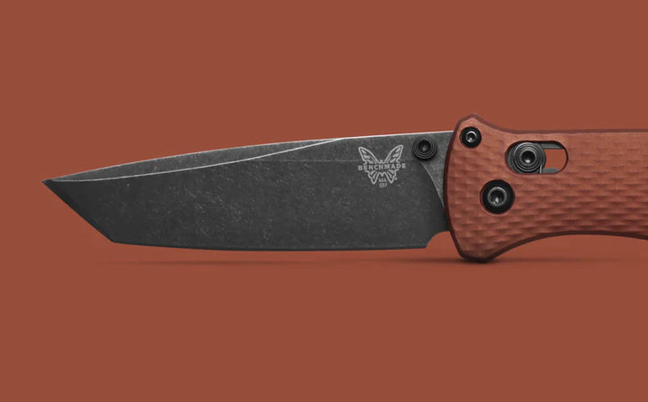 The new 537BK-07 Bailout® introduces CPM-MagnaCut stainless super steel with enhanced corrosion-resistance in a DLC Battlewash finish. Together with lightweight, diamond-textured Burnt Copper anodized aluminum handle scales and black oxide hardware, this ruggedized ultralight is ready for the next adventure.