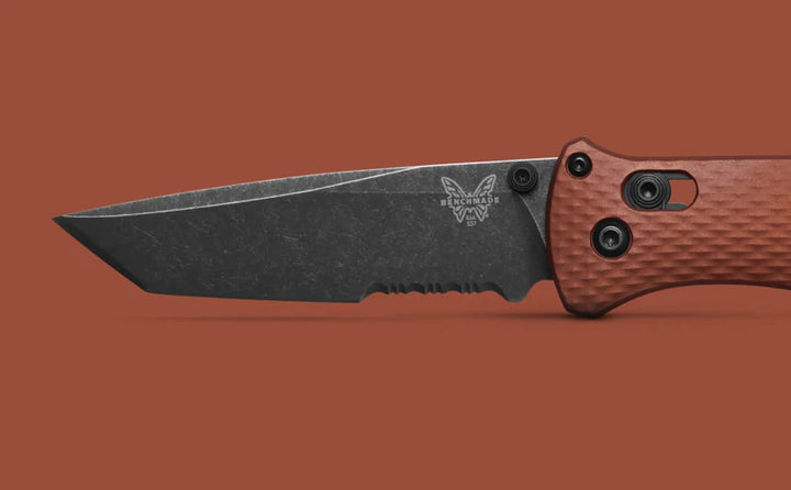 The new 537SBK-07 Bailout® introduces CPM-MagnaCut stainless super steel with enhanced corrosion-resistance in a DLC Battlewash finish. Together with lightweight, diamond-textured Burnt Copper anodized aluminum handle scales and black oxide hardware, this ruggedized ultralight is ready for the next adventure.