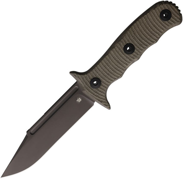 10.5" (26.67cm) overall. 5.25" (13.34cm) black PVD coated Bohler M390 stainless blade. Green canvas micarta handle. Collaboration with Vol West. Black Kydex belt sheath. Boxed.