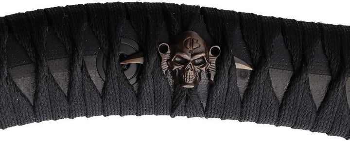 10.5" overall. 6.5" black Cerakote finish Bohler N690 stainless axe head with 4.5" cutting edge. Black smooth G10 handle. Full, extended tang. Lanyard hole. Black tsukamaki wrapped handle with bronze menuki skull emblem. Black leather belt sheath. Zippered storage case.