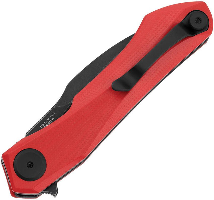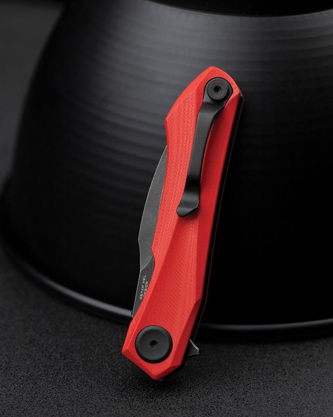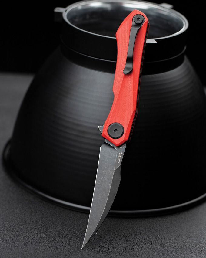 4" (10.16cm) closed. 3" (7.62cm) black stonewash finish 14C28N Sandvik stainless blade. Red G10 handle. Extended tang. Pocket clip. Boxed.