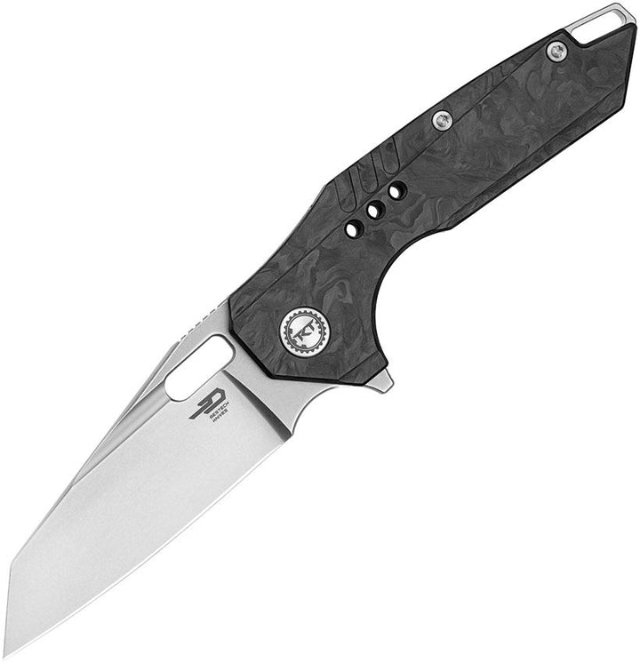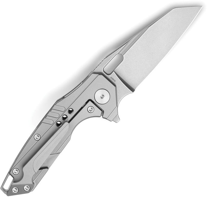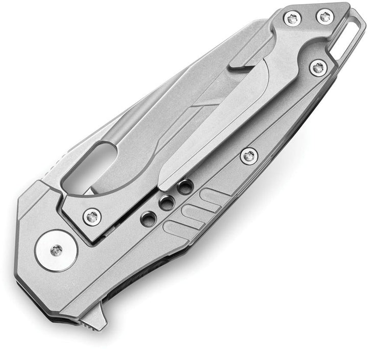 4" (10.16cm) closed. 3" (7.62cm) stonewash finish S35VN stainless blade. Marbled carbon fiber handle with gray titanium back handle. Extended tang. Lanyard hole. Pocket clip. Thumb pull. Black nylon pouch. Boxed.