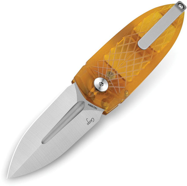3.25"" (8.26cm) closed. 2.25"" (5.72cm) satin finish 14C28N Sandvik stainless spear point blade. Ultem handle. Pocket clip. Boxed.