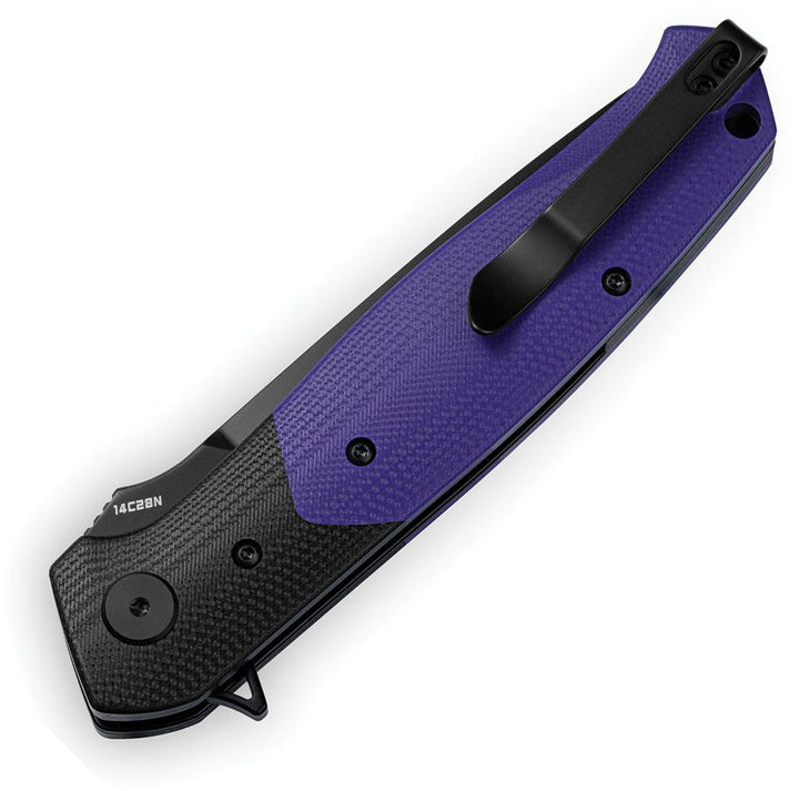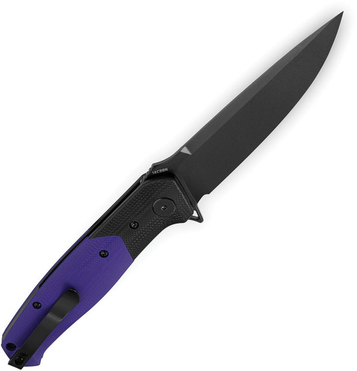 5.13" (13.03cm) closed. 4" (10.16cm) black stonewash finish 14C28N Sandvik stainless blade. Black and purple G10 handle. Extended tang. Lanyard hole. Pocket clip. Boxed.