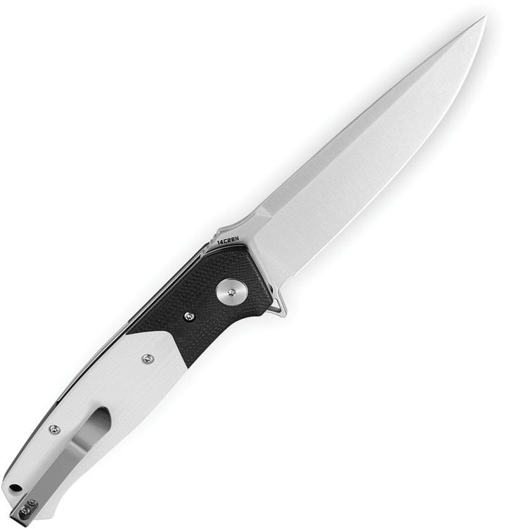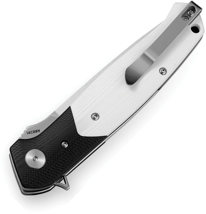 5.13" (13.03cm) closed. 4" (10.16cm) satin finish 14C28N Sandvik stainless blade. Black and white G10 handle. Extended tang. Lanyard hole. Pocket clip. Boxed.