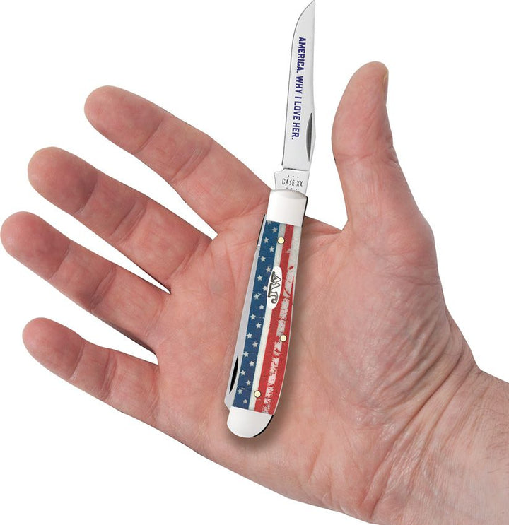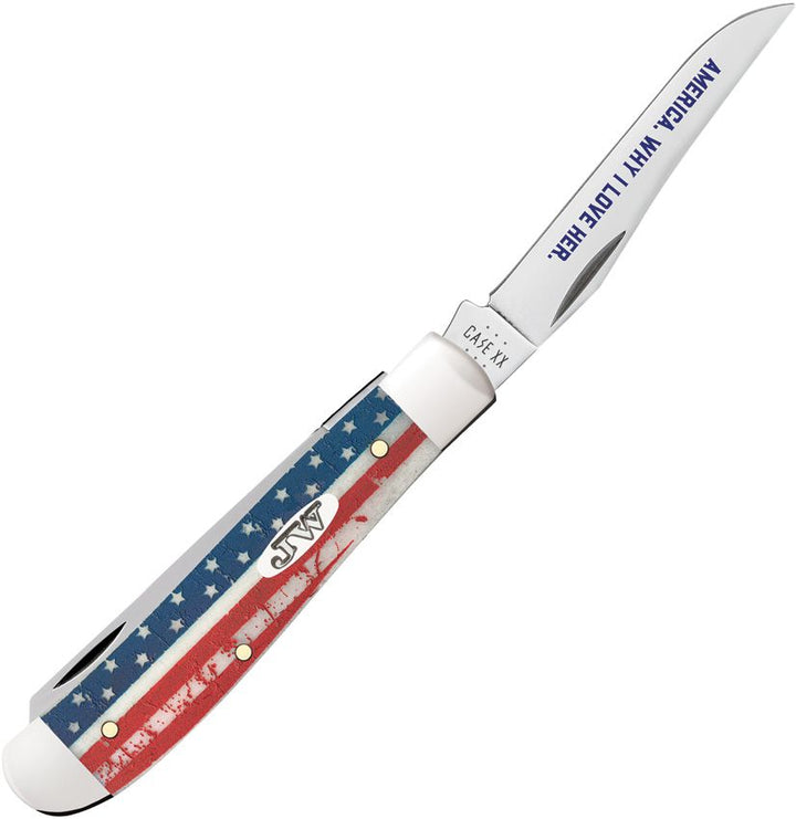 6207 SS pattern. 3.5" (8.89cm) closed. Mirror finish stainless clip and spey blades. Natural bone handle. Nickel silver bolster(s). Blade etching. American flag handle embellishment. Boxed.