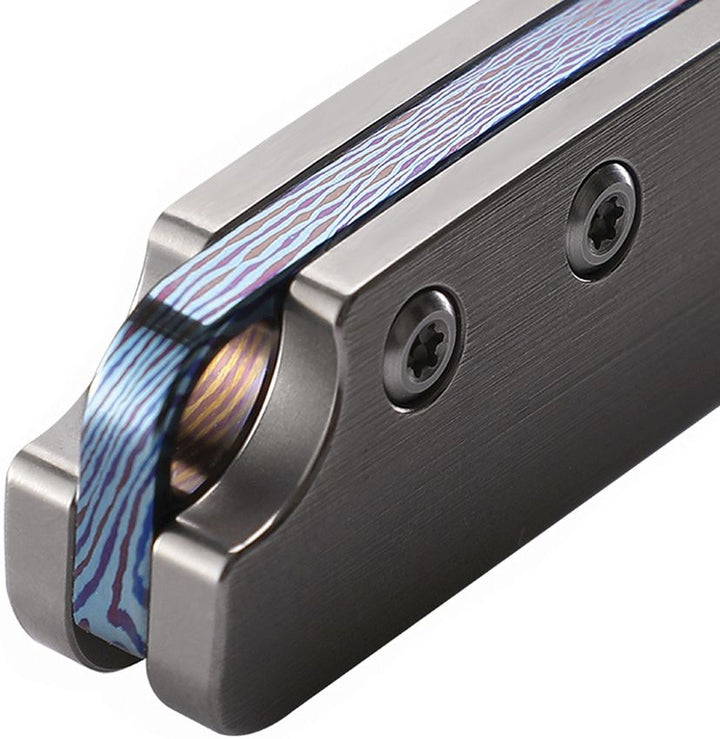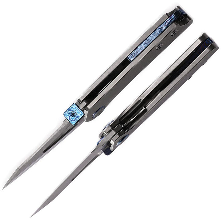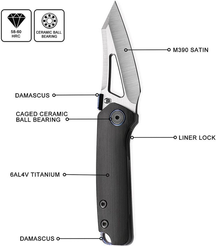 3.25" (8.26cm) closed. 2.63" (6.68cm) satin finish Bohler M390 stainless blade. Black titanium handle. Thumb disk. Lanyard hole. Pocket clip. Boxed.