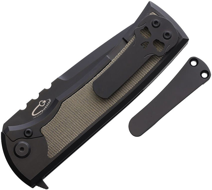 4.63" (11.76cm) closed. 3.63" (9.22cm) black stonewash finish Bohler M390 stainless tanto blade. Black titanium handle with green micarta front and back handle inlay. Lee Williams Kickstop flipper tab. Includes both a plain and Chaves signature skull titanium pocket clip. Boxed.