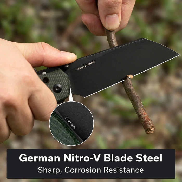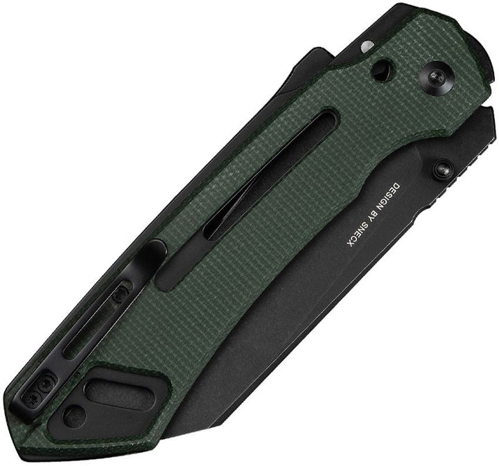 5.5" (13.97cm) closed. 4.25" (10.8cm) black stonewash finish Nitro V steel sheepsfoot blade. Green canvas micarta handle. Thumb stud. Extended tang. Pocket clip. Black nylon zippered storage case. Boxed.
