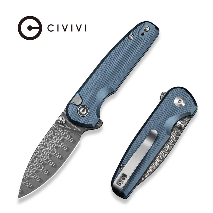Navaja Civivi Mini Shakan Button Lock Blue Aluminum Drop Point Damascus