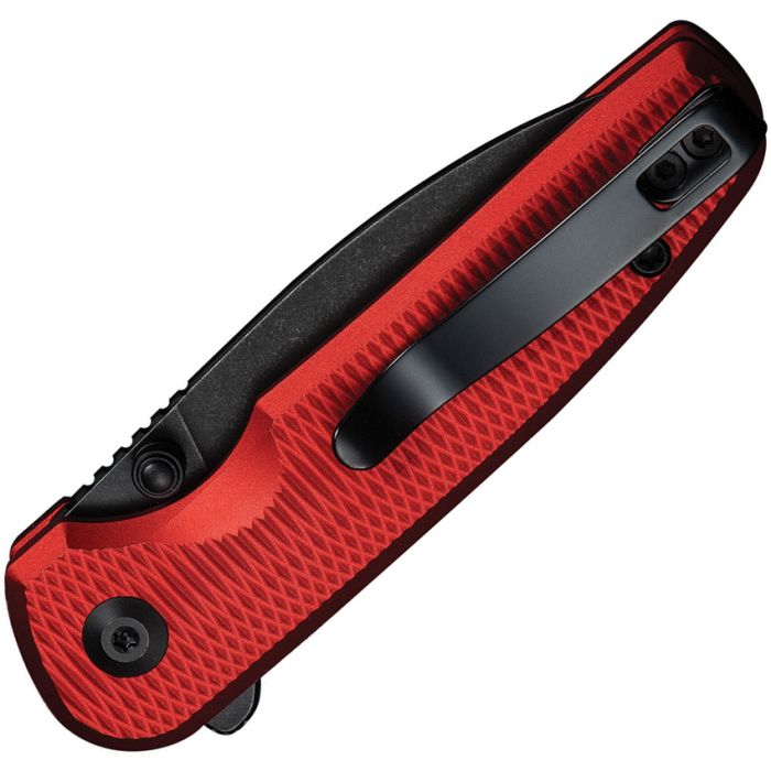 3.5" (8.89cm) closed. 2.5" (6.35cm) black stonewash finish Nitro V steel drop point blade. Red aluminum handle. Extended tang. Thumb stud. Pocket clip. Ripple pattern handle. Black nylon zippered storage case. Boxed.