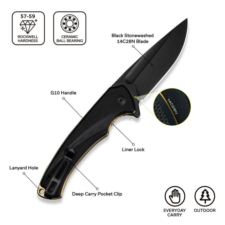 4.13" (10.49cm) closed. 3" (7.62cm) black stonewash finish 14C28N Sandvik stainless drop point blade. Black G10 handle. Extended tang. Lanyard hole. Pocket clip. Gold liners. Black nylon zippered storage case. Boxed.