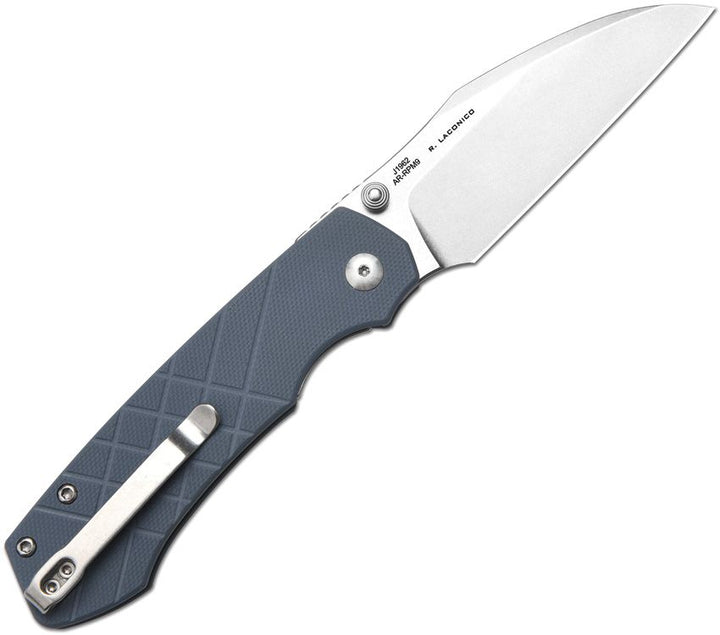 4.3" (10.92cm) closed. 3.3" (8.38cm) stonewash finish AR-RPM9 stainless Wharncliffe blade. Blue G10 handle. Extended tang. Thumb stud. Pocket clip. Black nylon zippered storage case. Boxed.