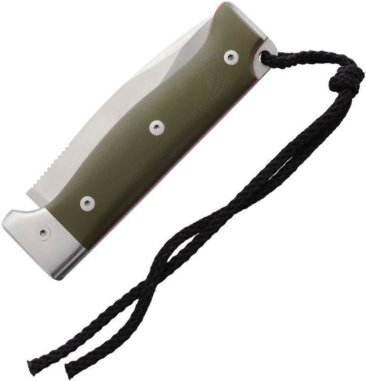 4.75" (12.07cm) closed. 3.75" (9.53cm) satin finish Bohler N690 stainless drop point blade. Green G10 handle. Stainless bolster(s). Lanyard hole. Orange liners. Black leather belt sheath.