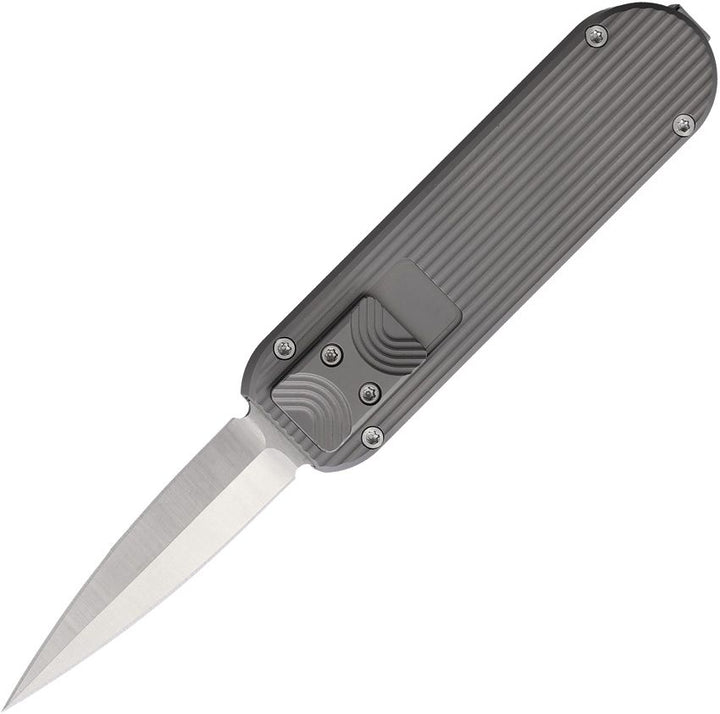 Automatic opening. 3.25" (8.26cm) closed. 2" (5.08cm) satin finish Bohler M390 stainless dagger blade. Gray fluted titanium handle. Pocket clip. Bagged.