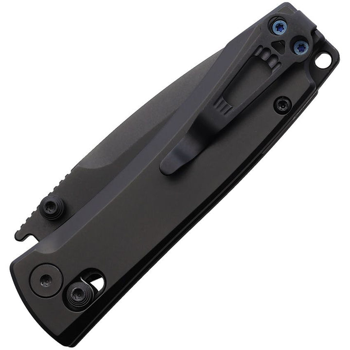 3.75" (9.53cm) closed. 3" (7.62cm) black finish MagnaCut steel drop point blade. Black titanium handle. Lanyard hole. Pocket clip. Thumb stud. Black nylon zippered storage case. Boxed.