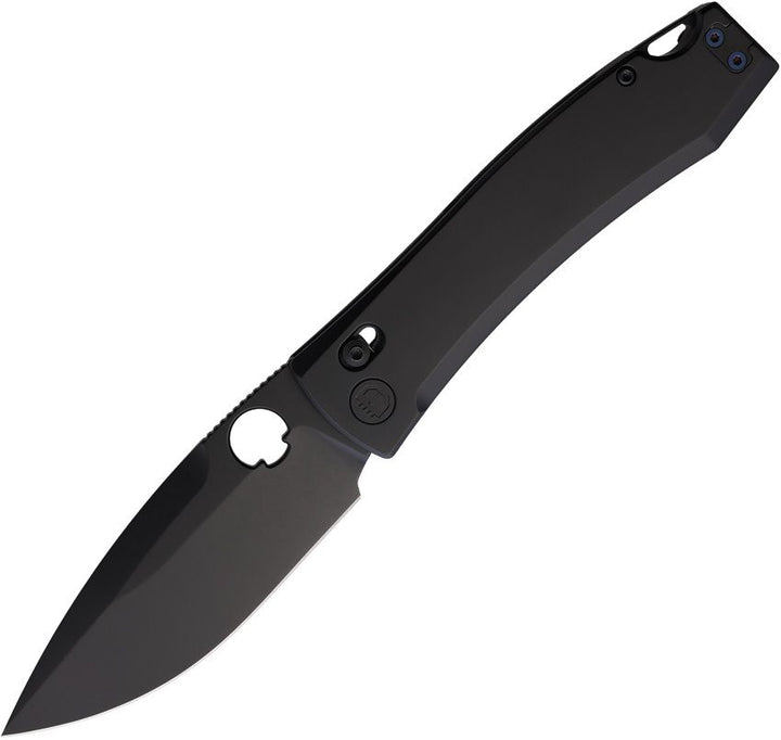 5" (12.7cm) closed. 4" (10.16cm) black DLC coated Magnacut stainless drop point blade. Black titanium handle. Thumb pull. Lanyard hole. Pocket clip. Black nylon zippered storage case. Boxed.