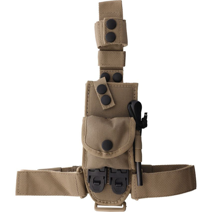 11.75" (29.85cm) overall. 6.5" (16.51cm) MIL-C-13924 burnished Bohler N690 stainless blade. Tan Forprene handle. Full, extended tang. Lanyard hole. Dark stone finish blade. Sheath features a mini pouch containing a paracord with flammable filament, which can be used in case of emergency and/or difficult climatic conditions, and a flint for lighting fires. Tan Cordura MOLLE compatible belt sheath. Boxed.