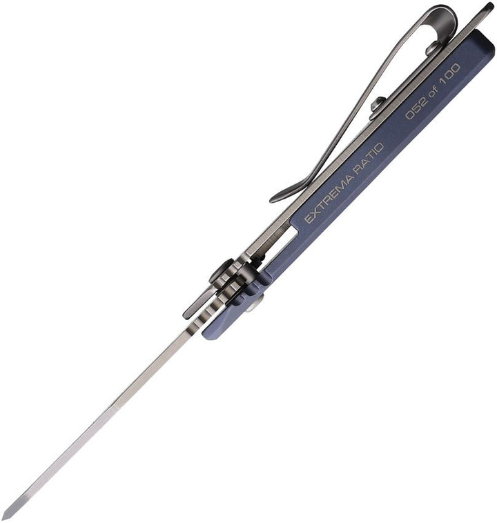 3" (7.62cm) closed. 2" (5.08cm) sand blast finish blade. Blue titanium handle. Thumb pull. Lanyard hole. Pocket clip. Sintered tungsten carbide blade. Serialized limited edition of 100 pieces, each packed in a sturdy technical polypropylene case equipped with a pressurization valve and resistant to weather, dust, and shock. Inside there is a metal plate that shows the serial number of the limited series, making each piece a true collectors item. Boxed.