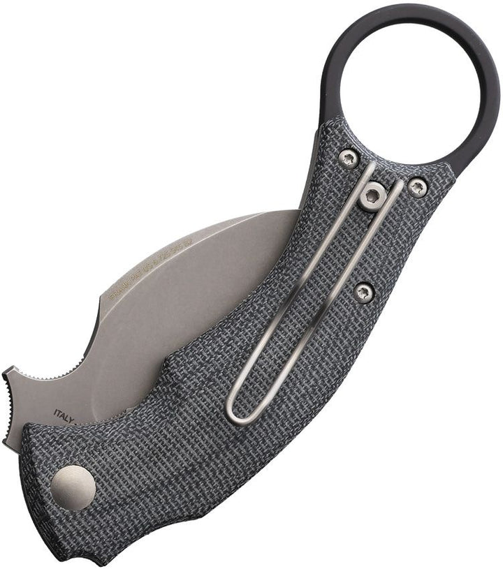 4.38" (11.13cm) closed. 2.25" (5.72cm) stonewash finish Bohler N690 stainless karambit blade. Black canvas micarta handle. Finger ring. Pocket clip. Extended tang. Boxed.