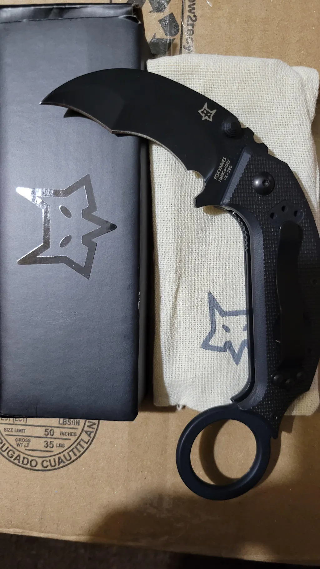 5" closed. 2 1/2" black finish N690Co Vanadium stainless karambit blade with dual thumb studs. Textured black G-10 handles with finger ring. Four way reversible black finish stainless pocket clip.