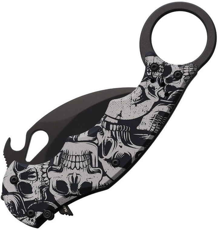 4.75" (12.07cm) closed. 2.5" (6.35cm) black coated Bohler N690 stainless karambit blade. Black aluminum handle. Finger ring. Pocket clip. Extended tang. Thumb pull. Skull handle artwork.
