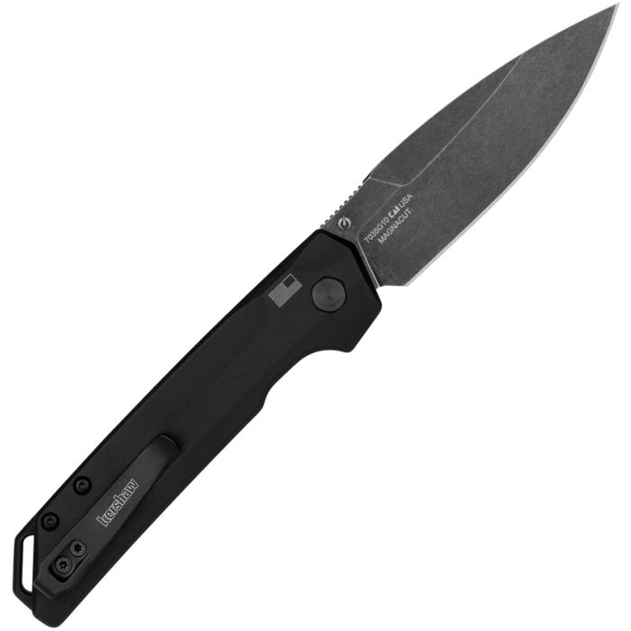 Automatic opening. 4.5" (11.43cm) closed. 3.5" (8.89cm) BlackWash finish CPM MagnaCut stainless spear point blade. Black G10 handle with black aluminum back handle. Pocket clip. Lanyard hole. Boxed.