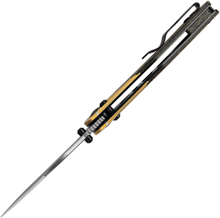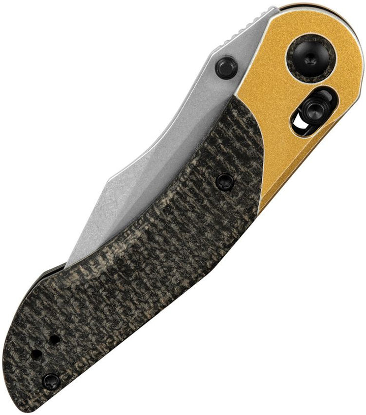 4.38" (11.13cm) closed. 3.25" (8.26cm) stonewash finish Nitro V steel blade. Black burlap micarta handle. Thumb stud. Pocket clip. Distressed copper color aluminum bolster. Boxed.