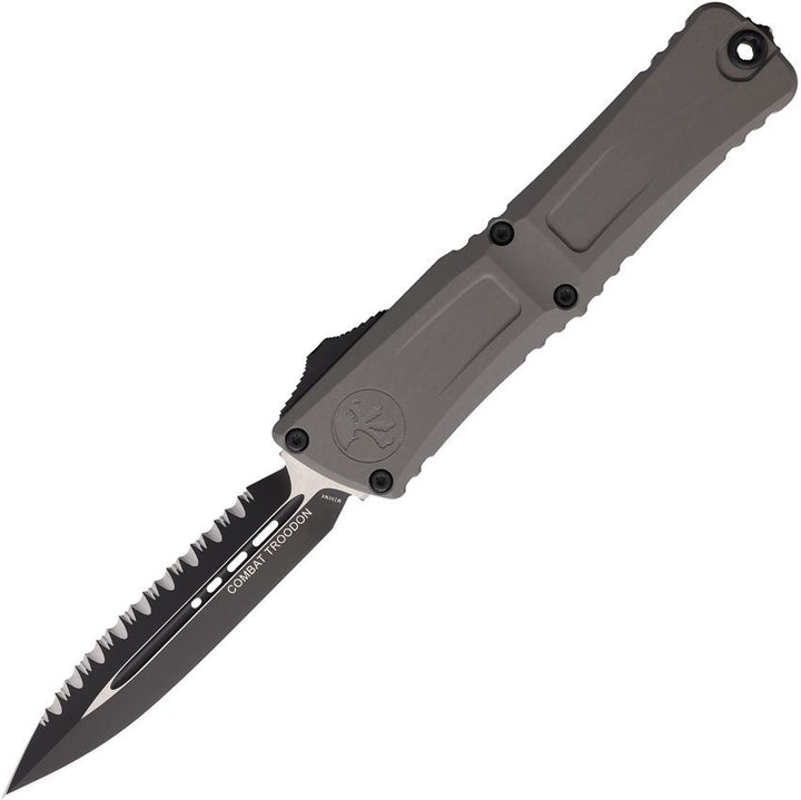 Automatic opening. 5.38" (13.67cm) closed. 4" (10.16cm) two-tone finish serrated premium steel dagger blade. Gray aluminum handle. Pocket clip. Lanyard hole. Glass breaker. Boxed.