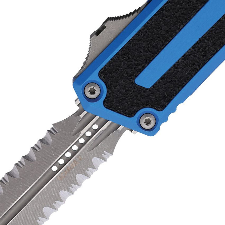 Navaja Automatica Microtech Auto Scarab II OTF Gen II Blue Aluminum w Black Traction Insert D/E P/Serrated Apocalyptic Bohler M390MK