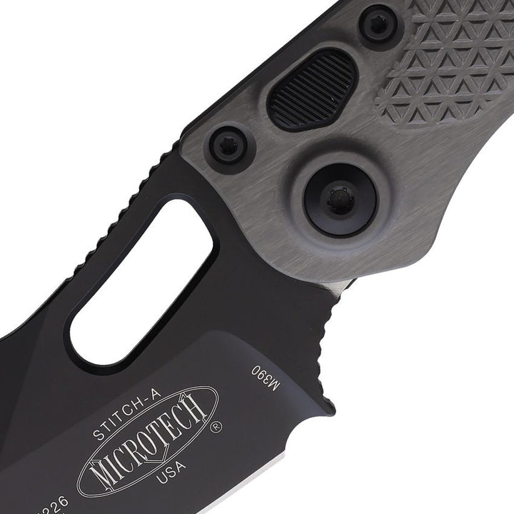 Navaja Automatica Microtech Auto Stitch Button Lock Gray Aluminum Black Wharncliffe Bohler M390