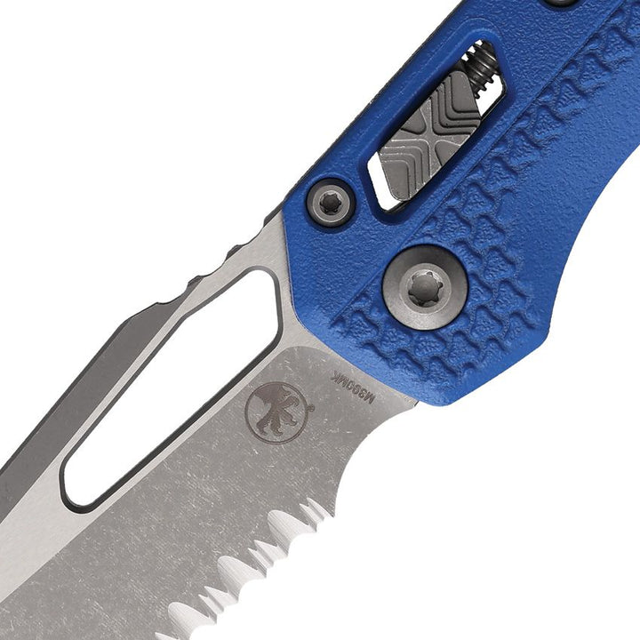 5" (12.7cm) closed. 3.75" (9.53cm) Apocalyptic finish full serrated Bohler M390MK stainless sheepsfoot blade. Blue polymer handle. Thumb pull. Lanyard hole. Pocket clip. Boxed.