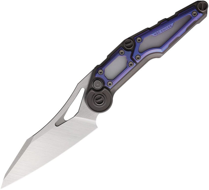 Navaja NOC Knives MT-32 Button Lock Gray & Blue Titanium Satin Wharncliffe Bohler M390