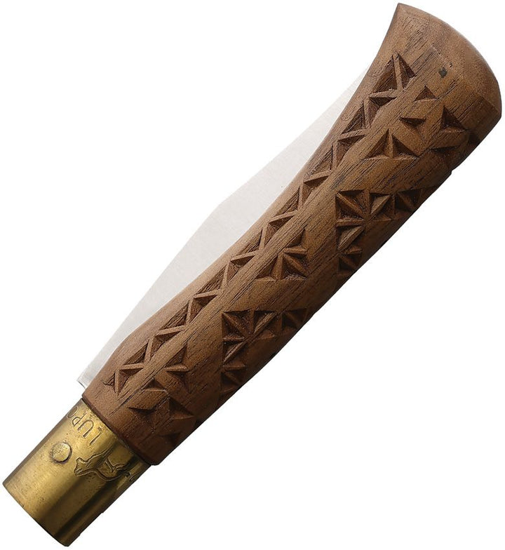 4.25" (10.8cm) closed. 3.25" (8.26cm) satin finish 420 stainless clip point blade. Brown wood handle. Brass bolster(s). Locking safety ring. Hand carved handle. Gift boxed.
