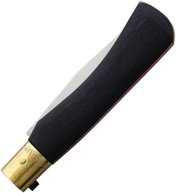 4.38" (11.13cm) closed. 3.13" (7.95cm) satin finish blade. Black laminated wood handle. Brass bolster(s). Locking safety ring. W.1.4060 nitrogen steel blade. Italian tricolor flag liner, Boxed.