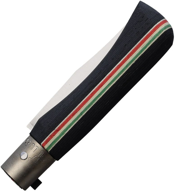4" (10.16cm) closed. 2.75" (6.99cm) satin finish blade. Locking safety ring. 1.4060 stainless blade. Black laminated wood handle with green, white, and red stripes. Boxed.
