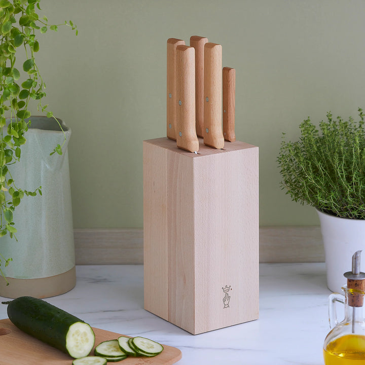Upgrade your kitchen and improve your knife skills with this contemporary set of five Parallele Chef Knives and a solid block. This set includes five knives to elevate your kitchen.