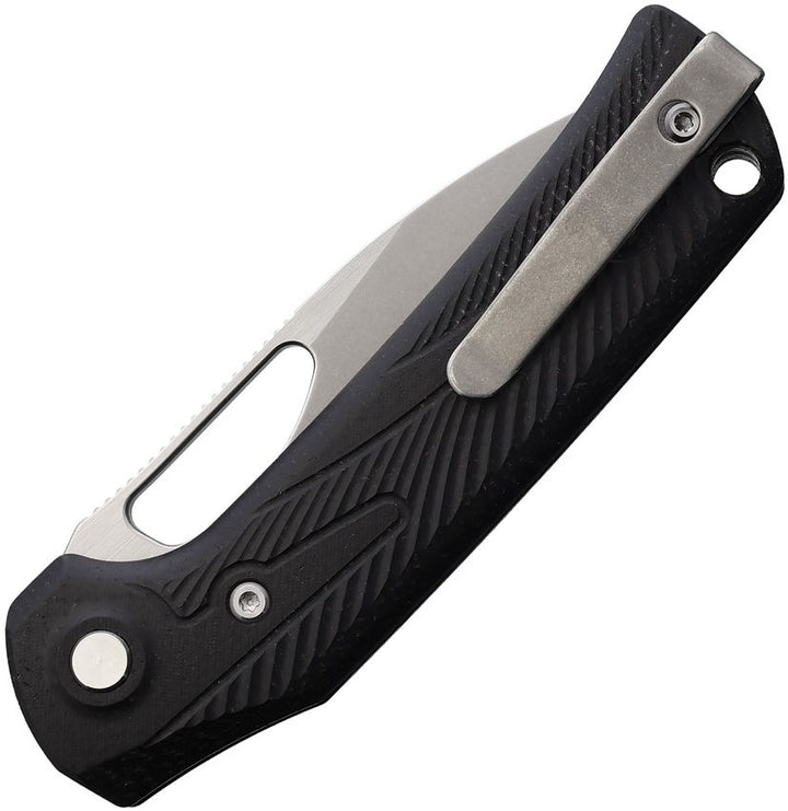 4.63" (11.76cm) closed. 3.38" (8.59cm) stonewash finish Nitro V steel blade. Black micarta handle. Thumb pull. Lanyard hole. Pocket clip. Boxed.