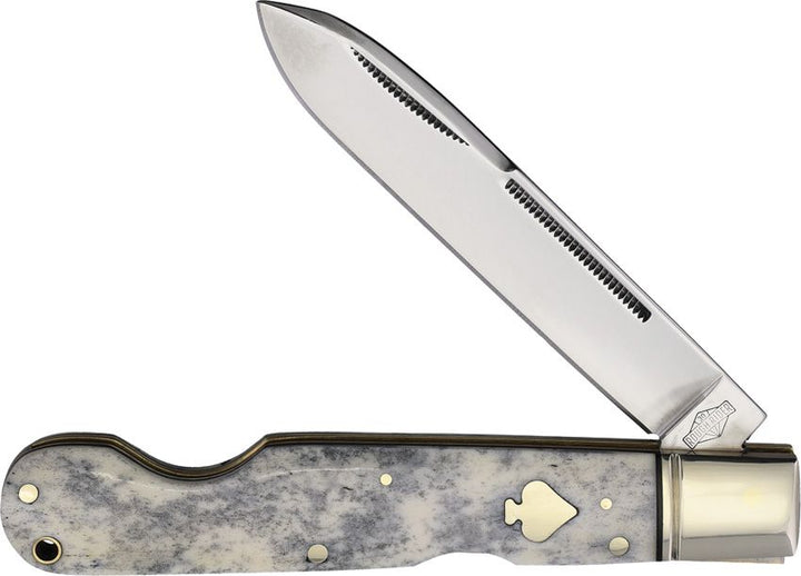 4.5" (11.43cm) closed. Mirror finish stainless spear blade. Gray smooth bone handle. Nickel silver bolster(s). Inlay shield. Lanyard hole. Boxed.