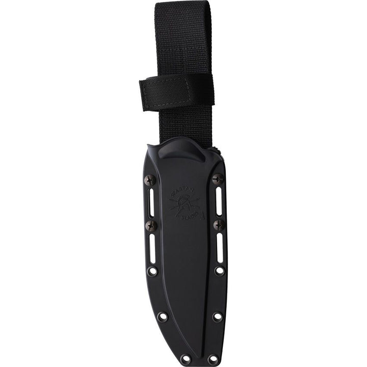 11.5" (29.21cm) overall. 6.13" (15.57cm) black powder coated 1095 Cro-Van carbon steel spear point blade. Black contoured nylon handle. Full tang. Lanyard hole. Black injection molded belt sheath with retention thumb lever. Boxed.