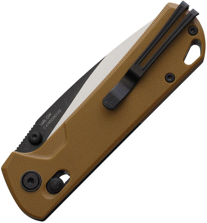 4.38" (11.13cm) closed. 3.38" (8.59cm) two-tone finish D2 tool steel blade. Flat Dark Earth G10 handle. Thumb stud. Lanyard hole. Pocket clip. Boxed.
