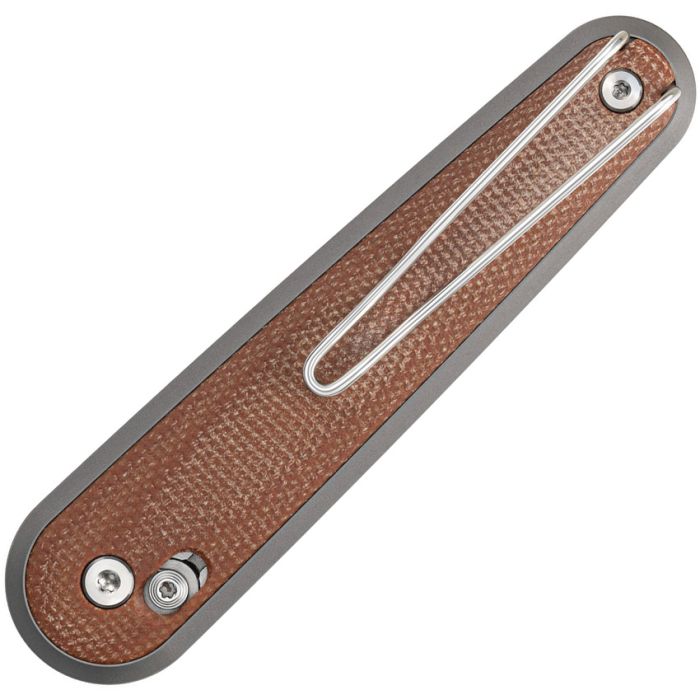 4" (10.16cm) closed. 3" (7.62cm) bead blast finish false edge Bohler N680 stainless dagger blade. Brown canvas micarta handle. Pocket clip. Boxed.