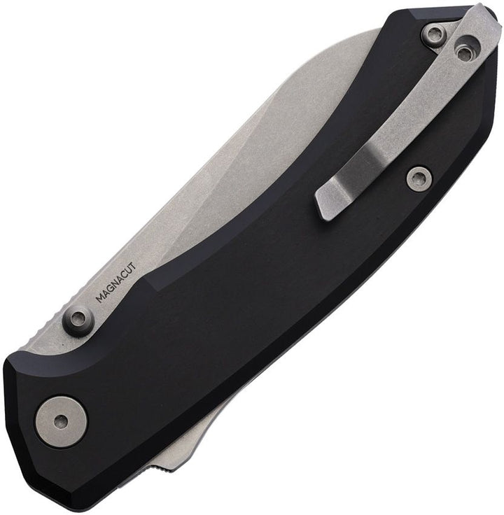 4.5" (11.43cm) closed. 3.38" (8.59cm) satin finish MagnaCut steel sheepsfoot blade. Black aluminum handle. Thumb stud. Extended tang. Pocket clip. Boxed.