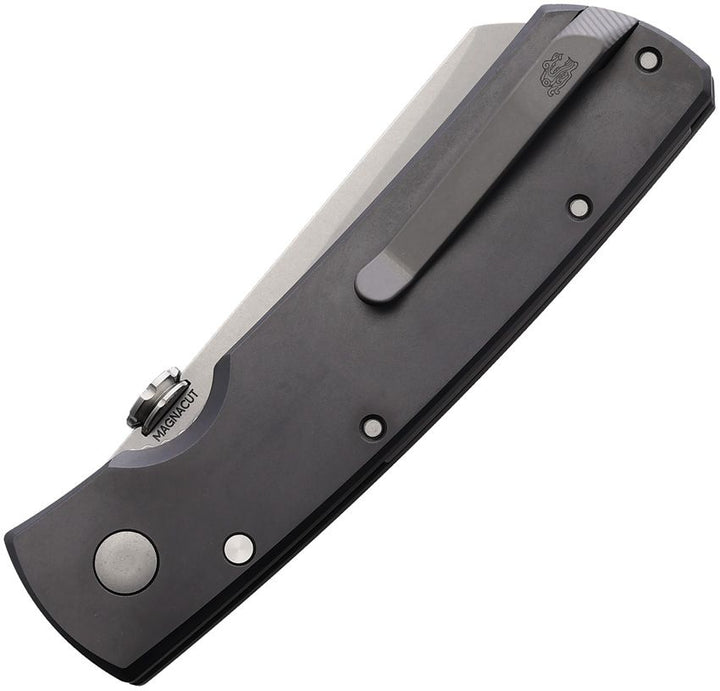 4.13" (10.49cm) closed. 3" (7.62cm) stonewash finish MagnaCut steel sheepsfoot blade. Black DLC coated titanium handle. Thumb disk. Pocket clip. Boxed.