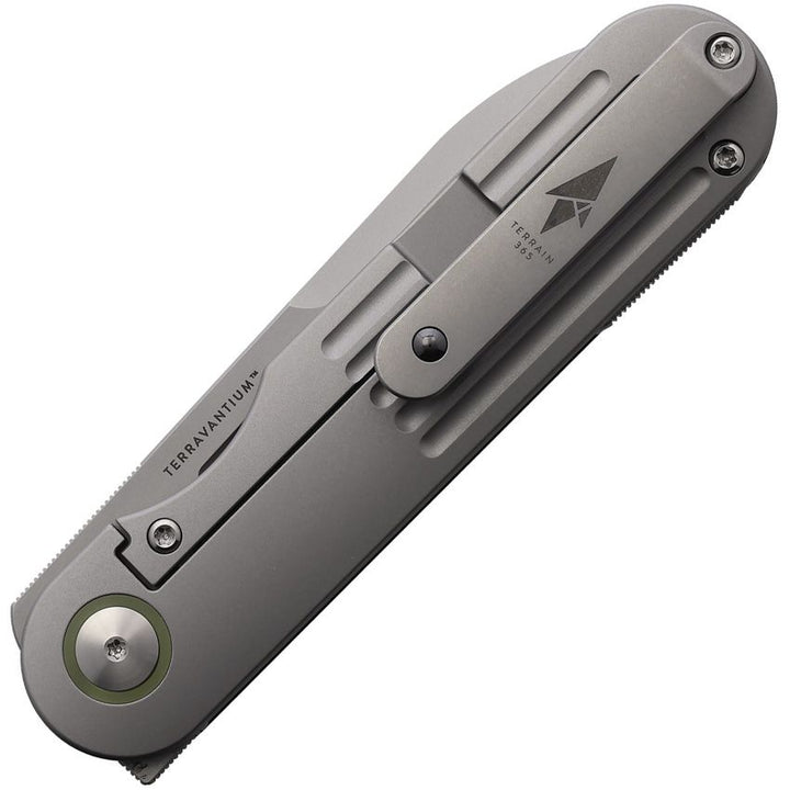 4.63" (11.76cm) closed. 3.5" (8.89cm) spear point blade. Carbon fiber handle with gray titanium back handle. Extended tang. Lanyard hole. Pocket clip. Terravantium Dendritic Cobalt blade. Hyperglow pivot rings. All titanium hardware. Black nylon zippered storage case. Boxed.