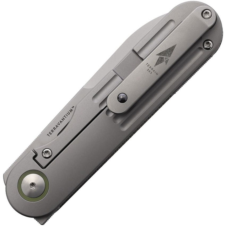 4.63" (11.76cm) closed. 3.5" (8.89cm) spear point blade. Green canvas micarta handle with gray titanium back handle. Extended tang. Lanyard hole. Pocket clip. Terravantium Dendritic Cobalt blade. Hyperglow pivot rings. All titanium hardware. Black nylon zippered storage case. Boxed.