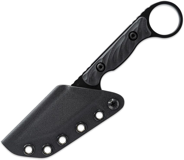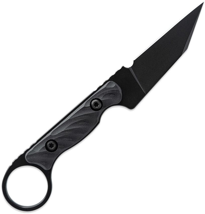 7" (17.78cm) overall. 3" (7.62cm) black oxide coated saber ground CPM-154 stainless tanto blade. Black sculpted G10 handle. Full, extended tang. Finger ring. Black Kydex belt sheath. Boxed.