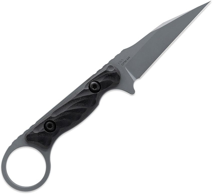 7" (17.78cm) overall. 3" (7.62cm) gray Gun-Kote finish CPM-M4 stainless Wharncliffe blade. Black sculpted G10 handle. Full, extended tang. Finger ring. FlexTech Kydex belt sheath. Boxed.