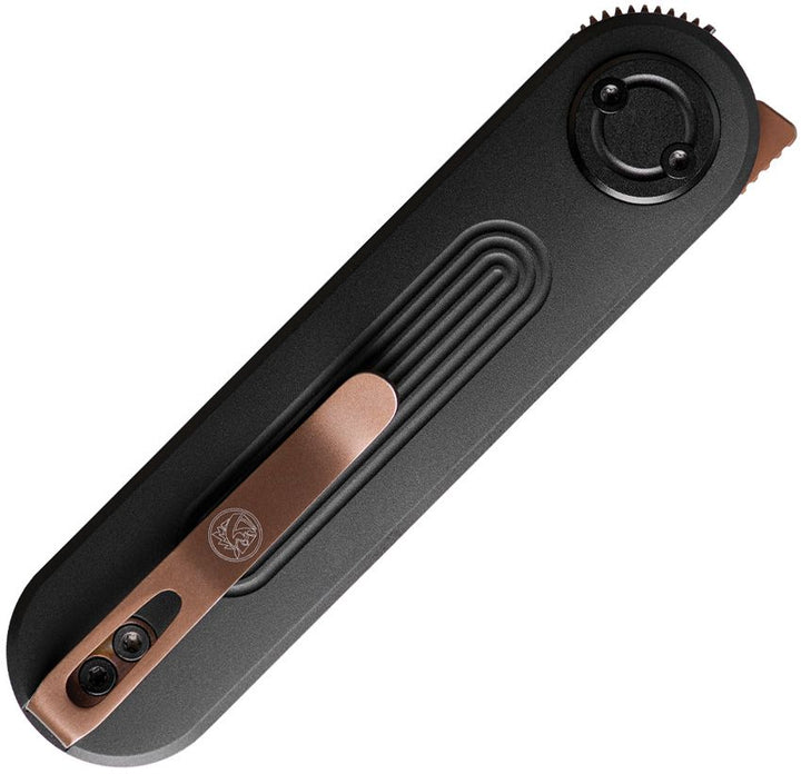 4" (10.16cm) closed. 3" (7.62cm) S35VN stainless drop point blade. Black aluminum handle. Pocket clip. Extended tang. Copper Dune finish blade. Black nylon pouch. Boxed.