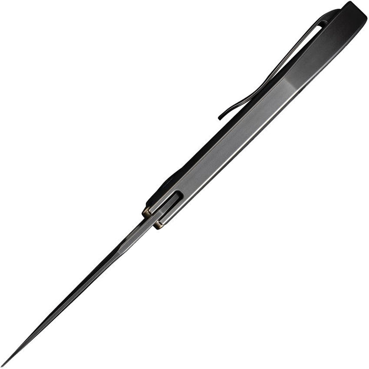 4.88" (12.4cm) closed. 3.5" (8.89cm) gray finish CPM-20CV stainless blade. Gray titanium handle. Extended tang. Thumb stud. Thumb pull. Pocket clip. Black nylon zippered storage case. Boxed.